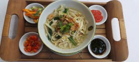 Fried noodles with meatballs, shrimp, eggs, and satays favourite PB XI As long noodles we have a long patience. and
